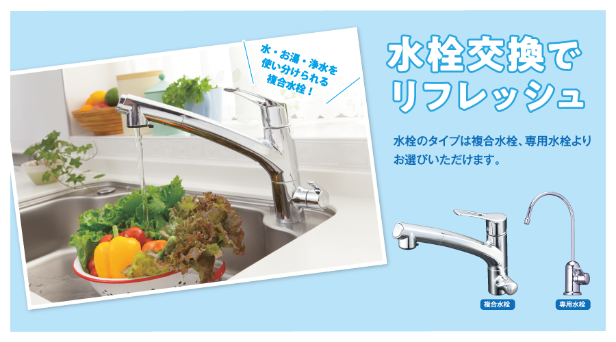 水栓リフレッシュ交換には水道工事が必要です。お住まいの地域により、切替工事をお受けできない場合もございます。予めご了承のほど、よろしくお願いいたします。